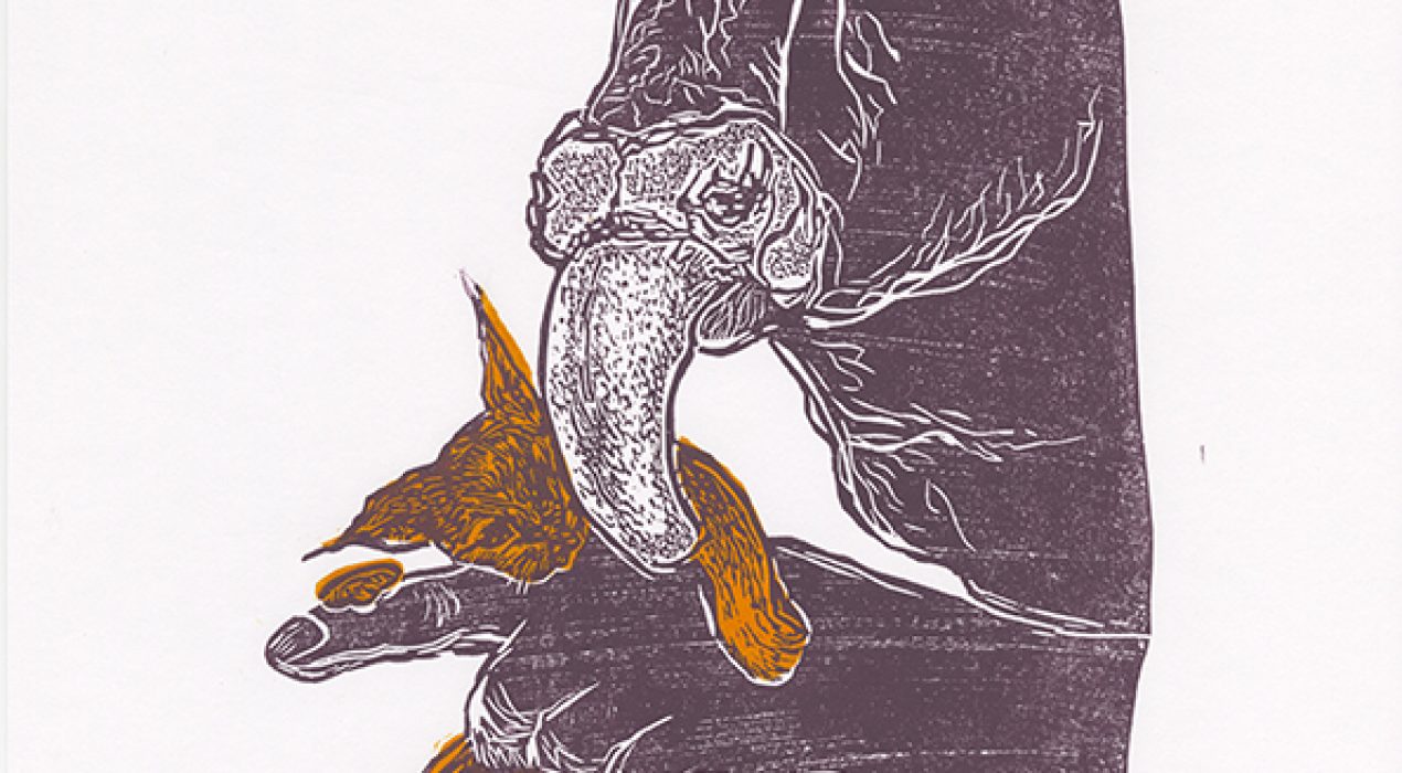 serie mythe, minotaurus en meer techniek linoprint 2 kleurenprint, inkt op papier 30 x 40 cm 2023