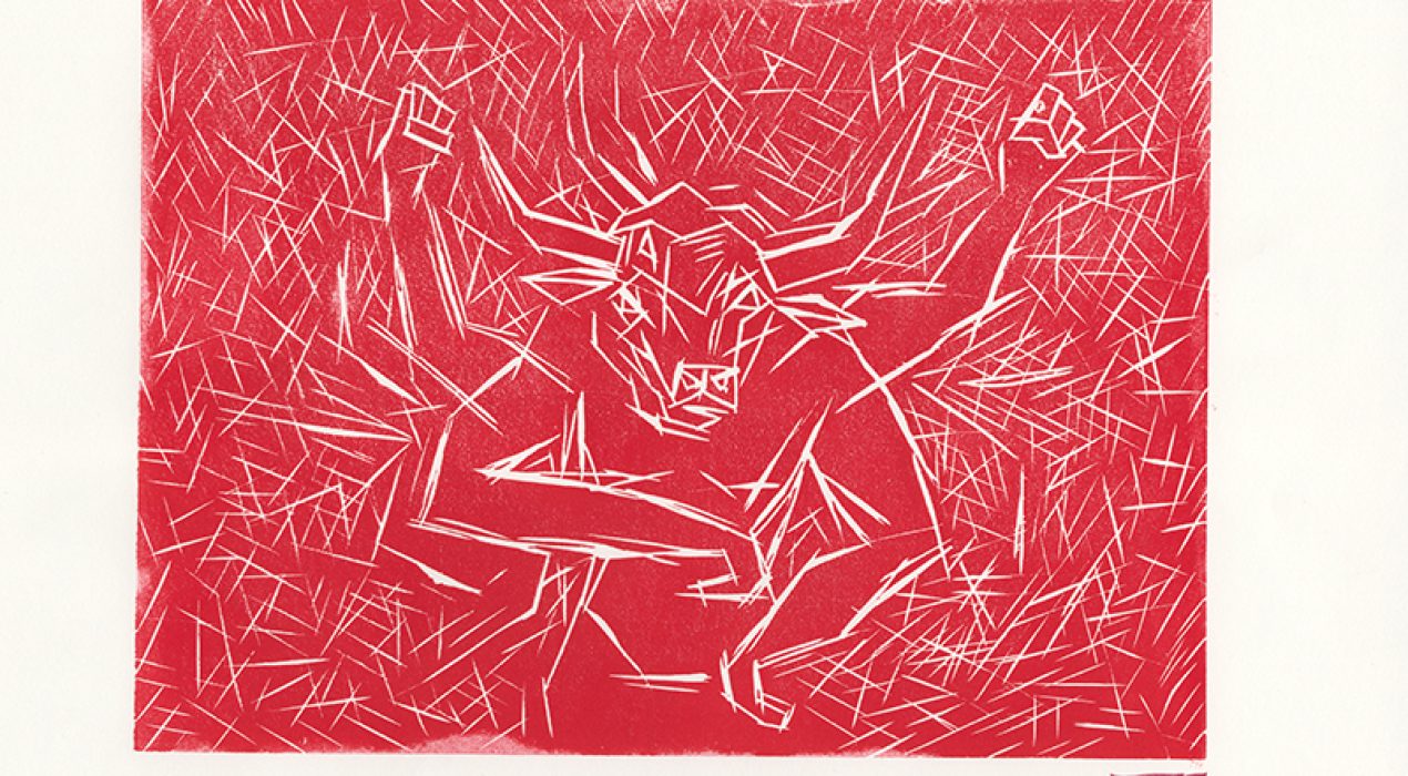 serie mythe, minotaurus en meer techniek linoprint 3 kleurenprint, inkt op papier 30 x 40 cm 2023